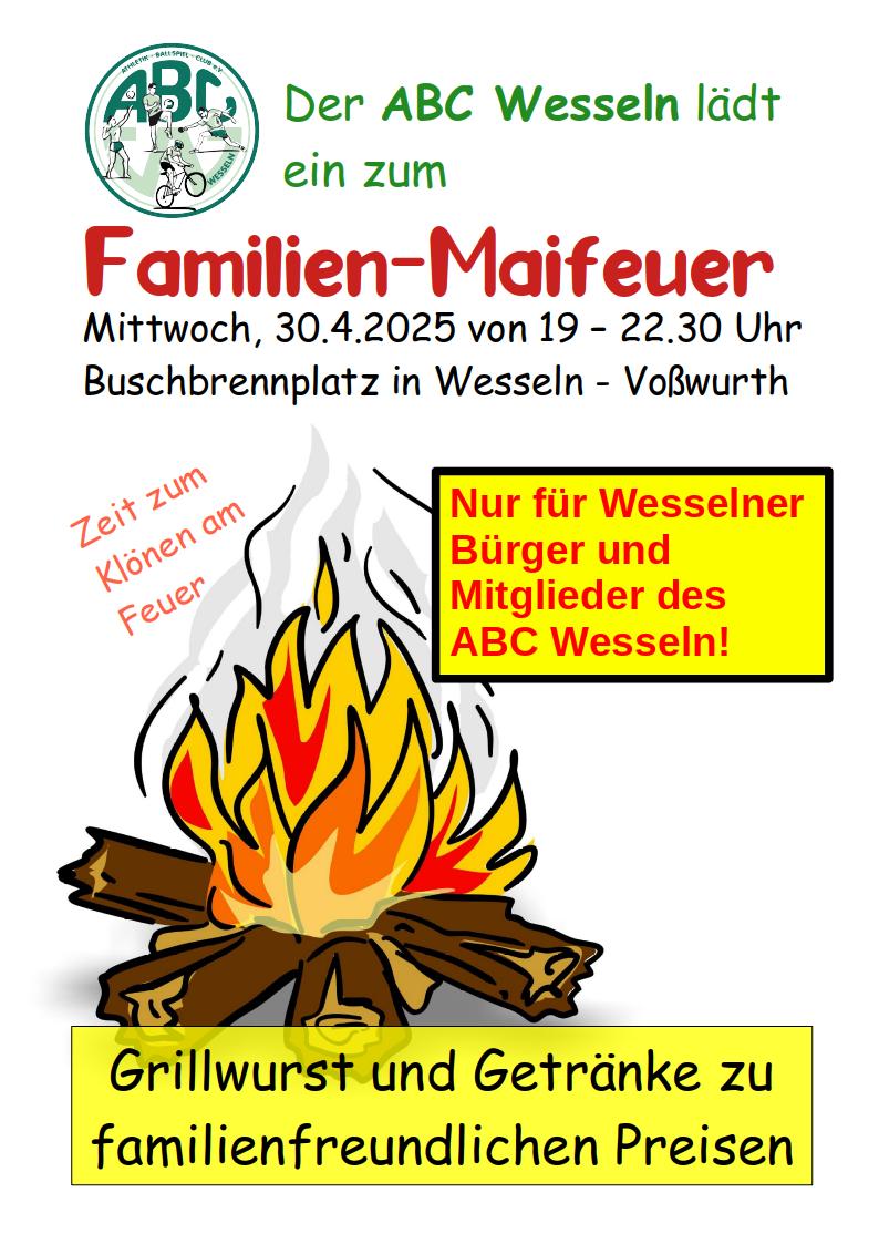 Der ABC Wesseln lädt herzlich ein zum Familien-Maifeuer am Mittwoch, den 30. April 2025 von 19:00 bis 22:30 Uhr auf dem Buschbrennplatz in Wesseln–Voßwurth.