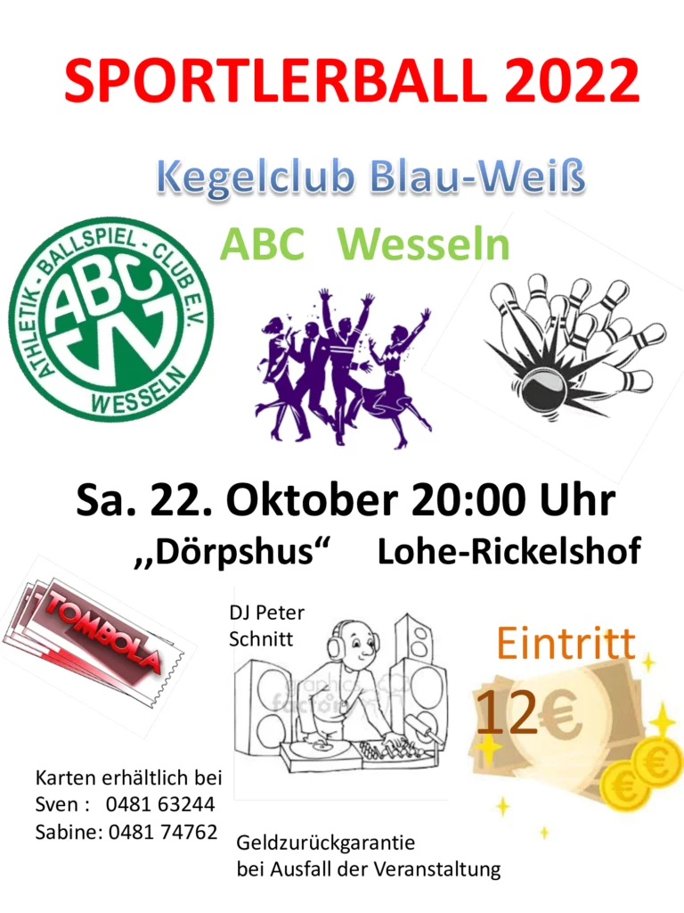 Dieses Jahr findet endlich wieder unser Sportlerball zusammen mit dem Kegelclub Blau Weiß statt im Dörpshus am 22. Oktober 2022 statt.